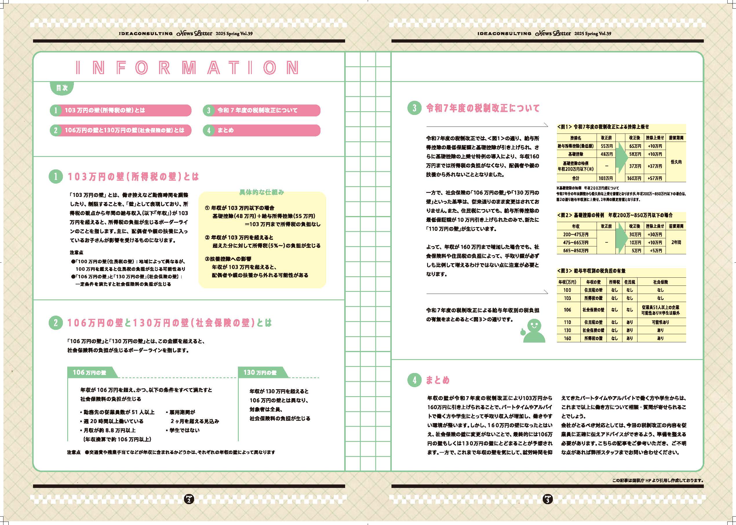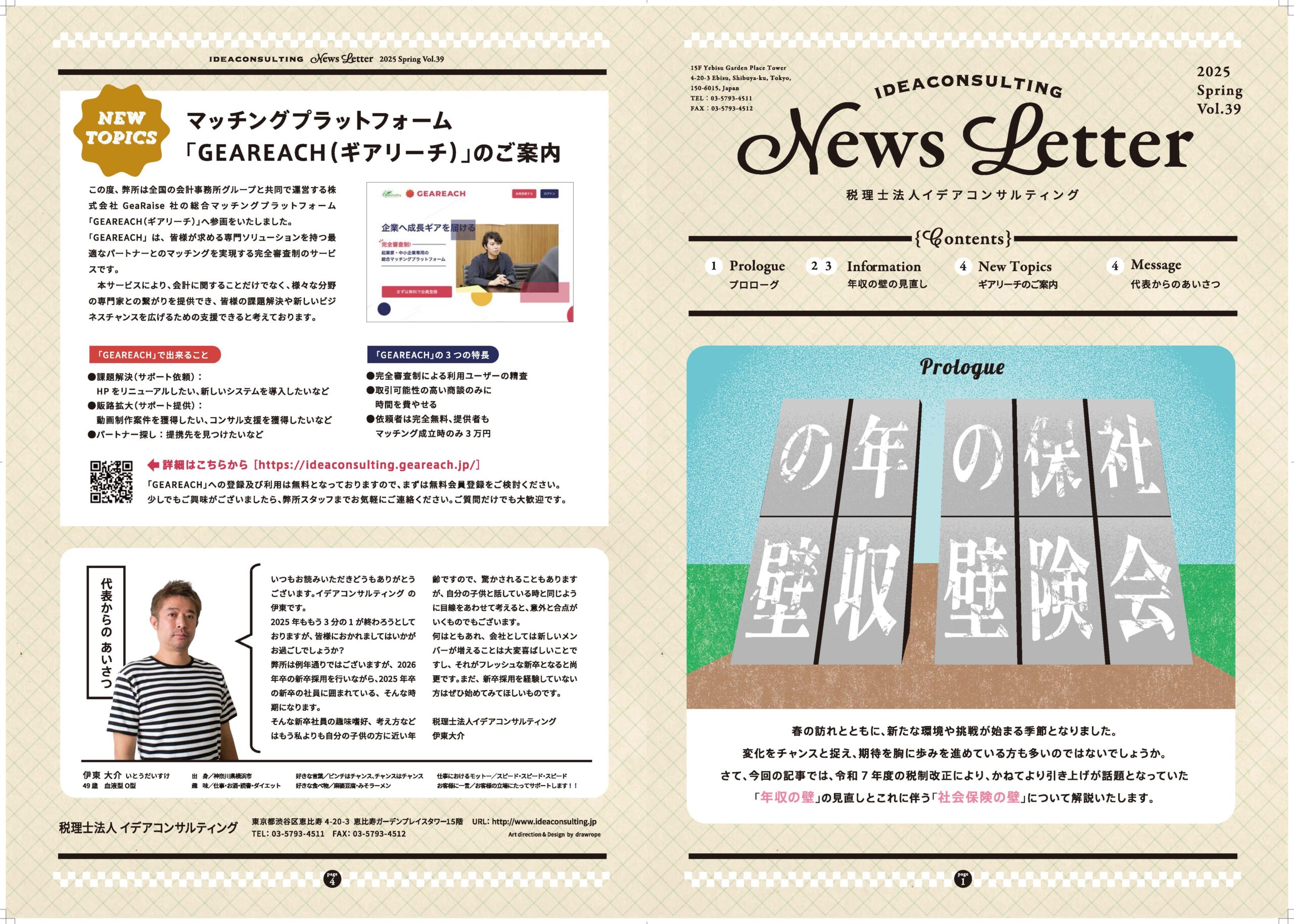 事務所通信【2025 No.39】 2月 20, 2026 皆様こんにちは。 シーズンごとに発行しているイデアコンサルティングオリジナルの事務所通信【News Letter】をご案内致します。 今回は『社会保険の壁 年収の壁』を中心に解説させていただいております。 一覧に戻る